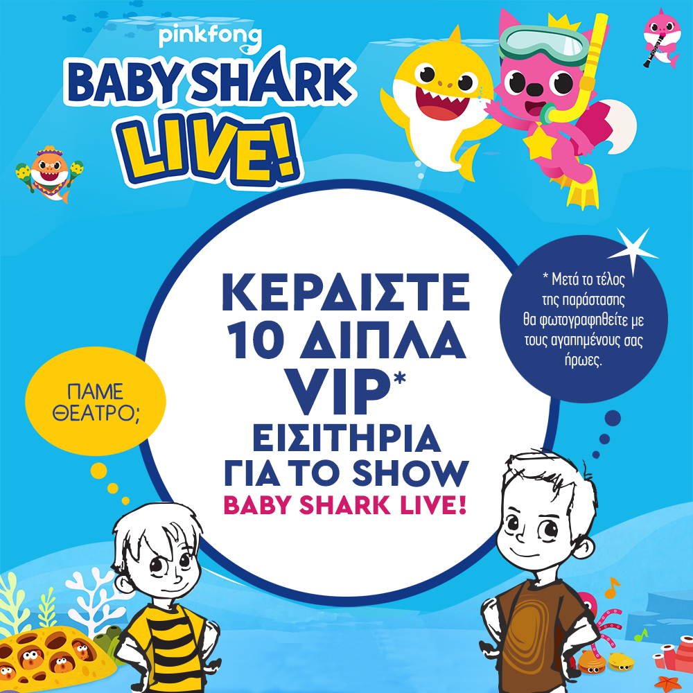 Tο “Baby Shark Live!” είναι μία καταιγιστική θεατρική περιπέτεια, που περιέχει το πασίγνωστο αυθεντικό αγαπημένο τραγούδι “Pinkfong’s Baby Shark” με τις πρωτοφανείς σε παγκόσμια κλίμακα 4 δις προβολές στο YouTube και τα πιο γνωστά Αγγλικά παιδικά τραγούδια του Pinkfong.Μικροί και μεγάλοι έχουν την ευκαιρία να χορέψουν και να τραγουδήσουν Αγγλικά τραγούδια, μαζί με τους αγαπημένους τους ήρωες. Η παράσταση είναι ένα μουσικοκινητικό υπερθέαμα με φαντασμαγορικά κοστούμια, πολύχρωμα σκηνικά και υπερσύγχρονο video wall (γιγαντοοθόνη).Ένα show που αποτελεί μια διασκεδαστική εκπαιδευτική διαδικασία μάθησης για παιδιά προσχολικής και πρώτης σχολικής ηλικίας.⠀