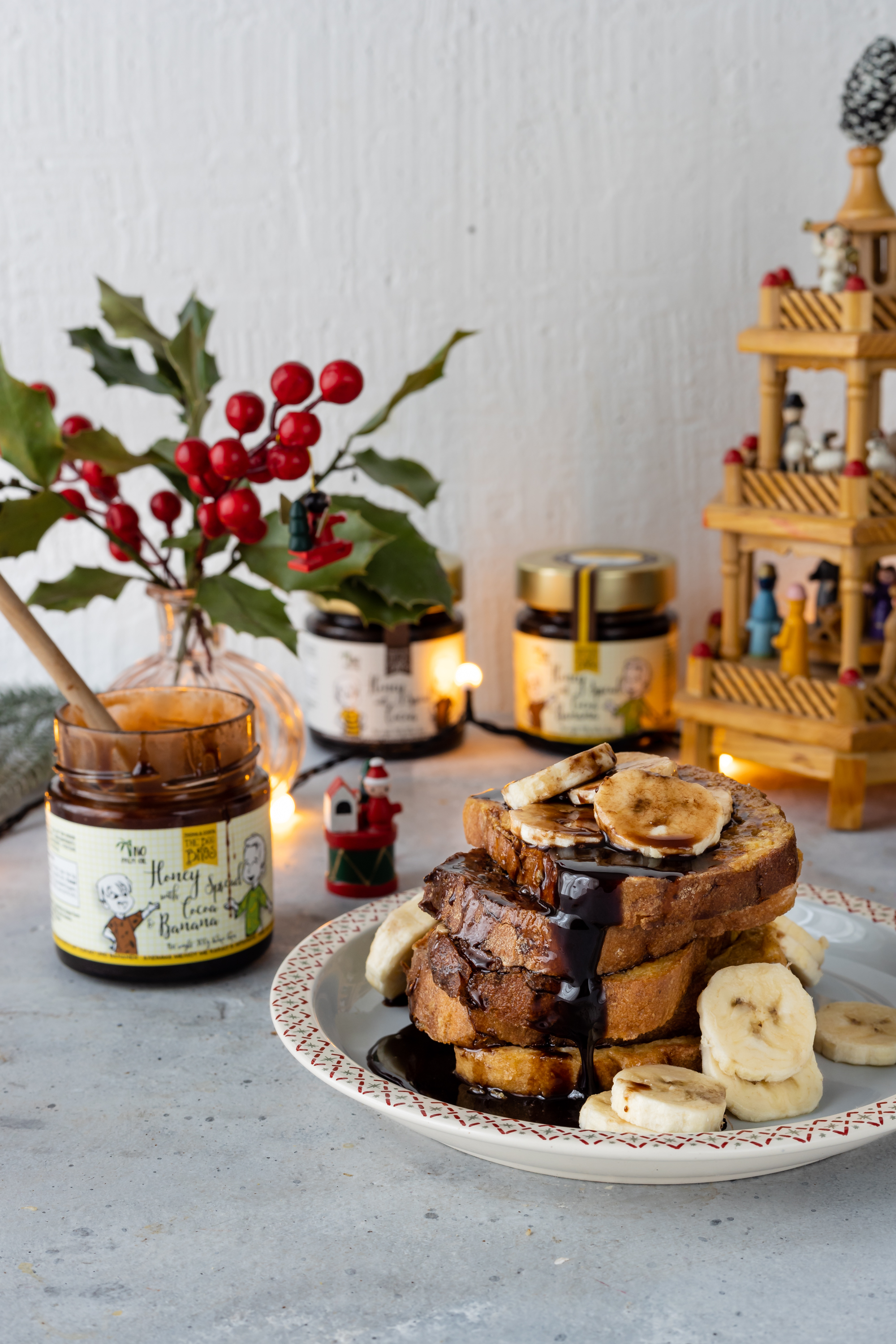 6. Σερβίρουμε ζεστές με φέτες μπανάνας και άλειμμα Bee Bros με κακάο και μπανάνα.
